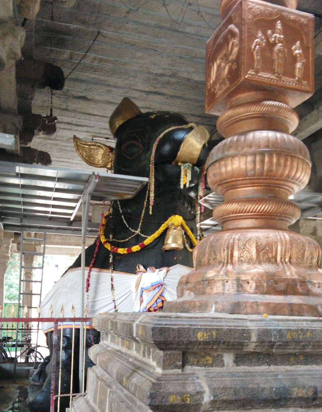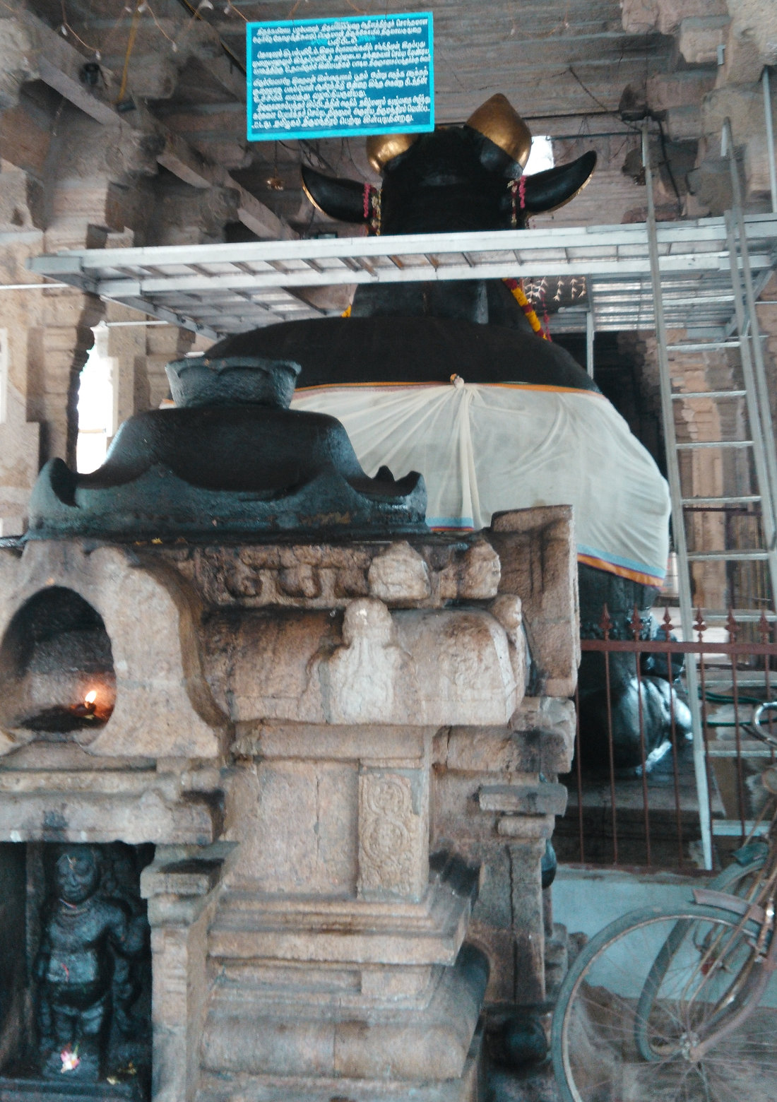 All the Nandhis of this temple are believed to have merged together and become one big Nandhi, which can be seen in front of the lord. The height of this Nandhi is about 15 feet. There is also another smaller Nandhi in front of the big one.