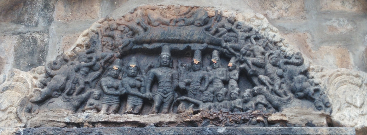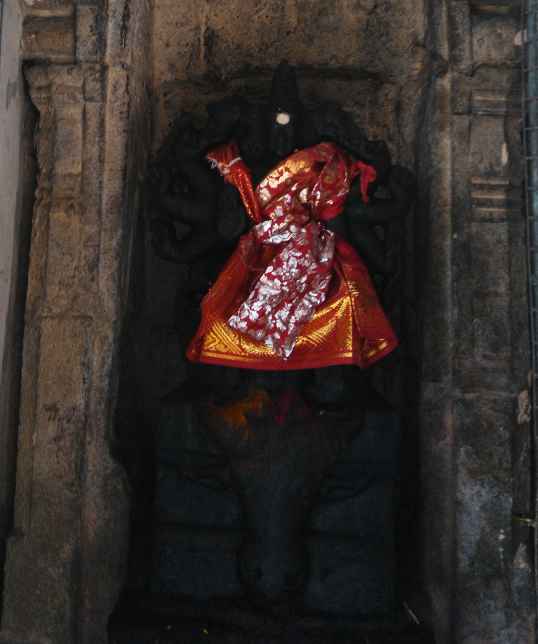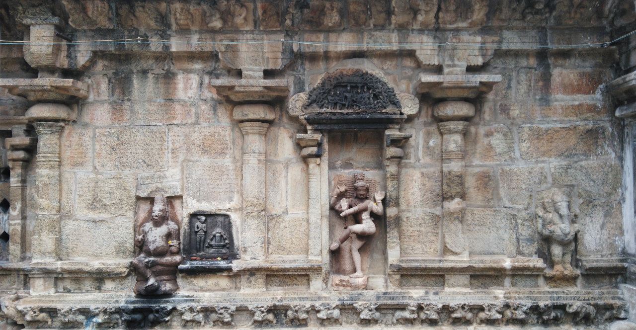 A beautiful relief depicting Lord Shiva and Goddess Parvathy’s wedding can be seen above the idol of Lord Natarajar.