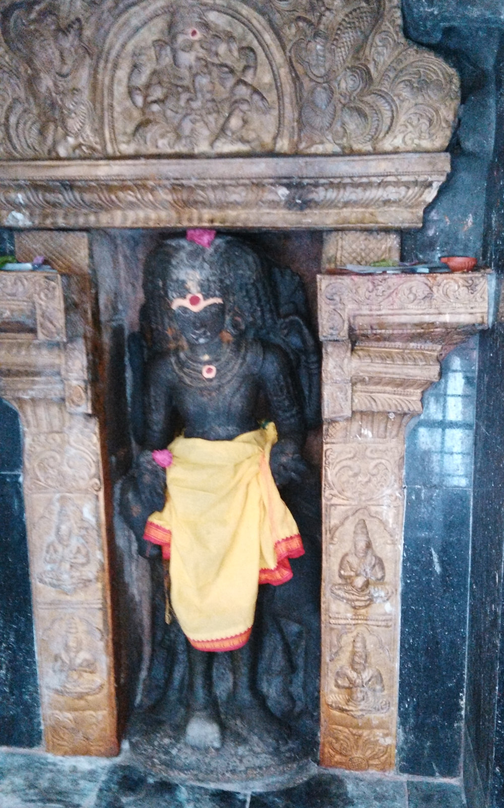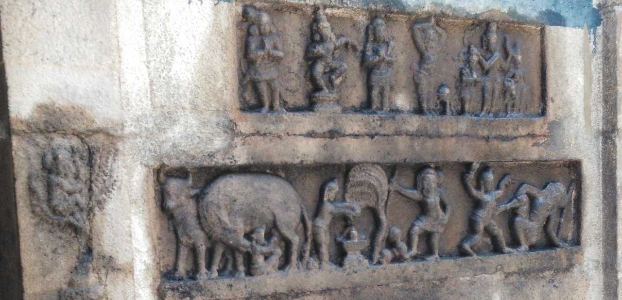 In the wall of the sanctum, there are beautifully carved reliefs depicting the life of Chandikeswarar.