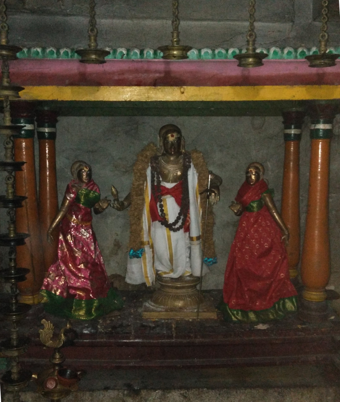 The beautiful procession idols made of bronze (Utsava Murthy) of Lord Natarajar with Sivakami Amman, Vinayakar, Murugan, Bhikshandavar, Saint Sundaramurthy Nayanar with his two wives and the Nalvar can be seen in the temple’s hall.