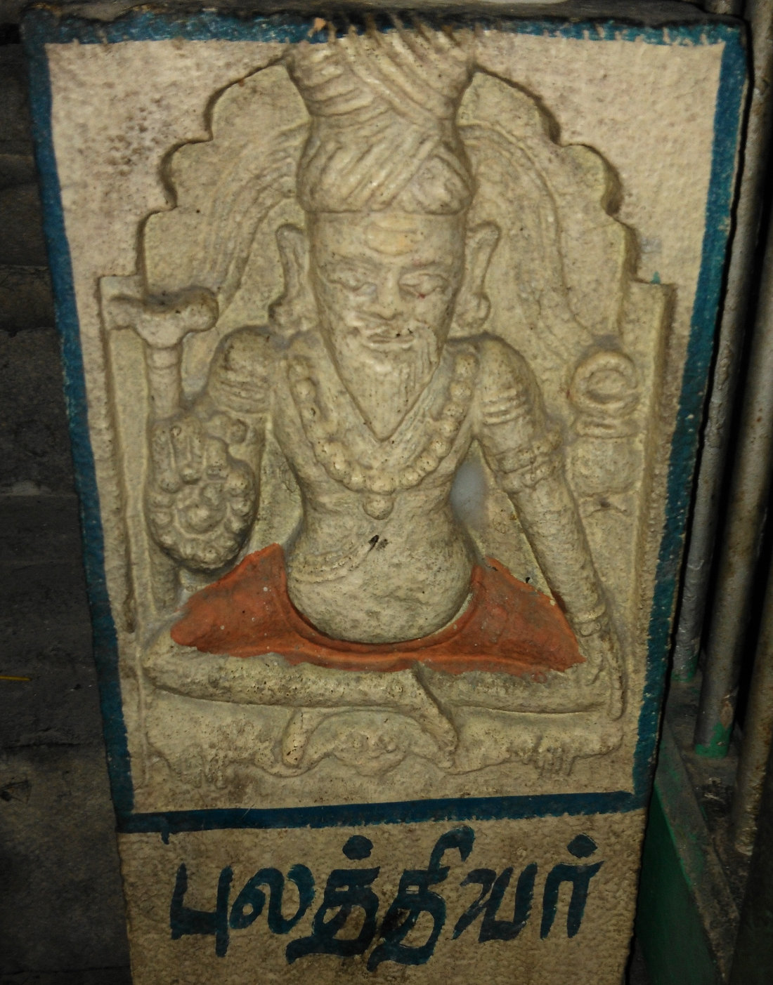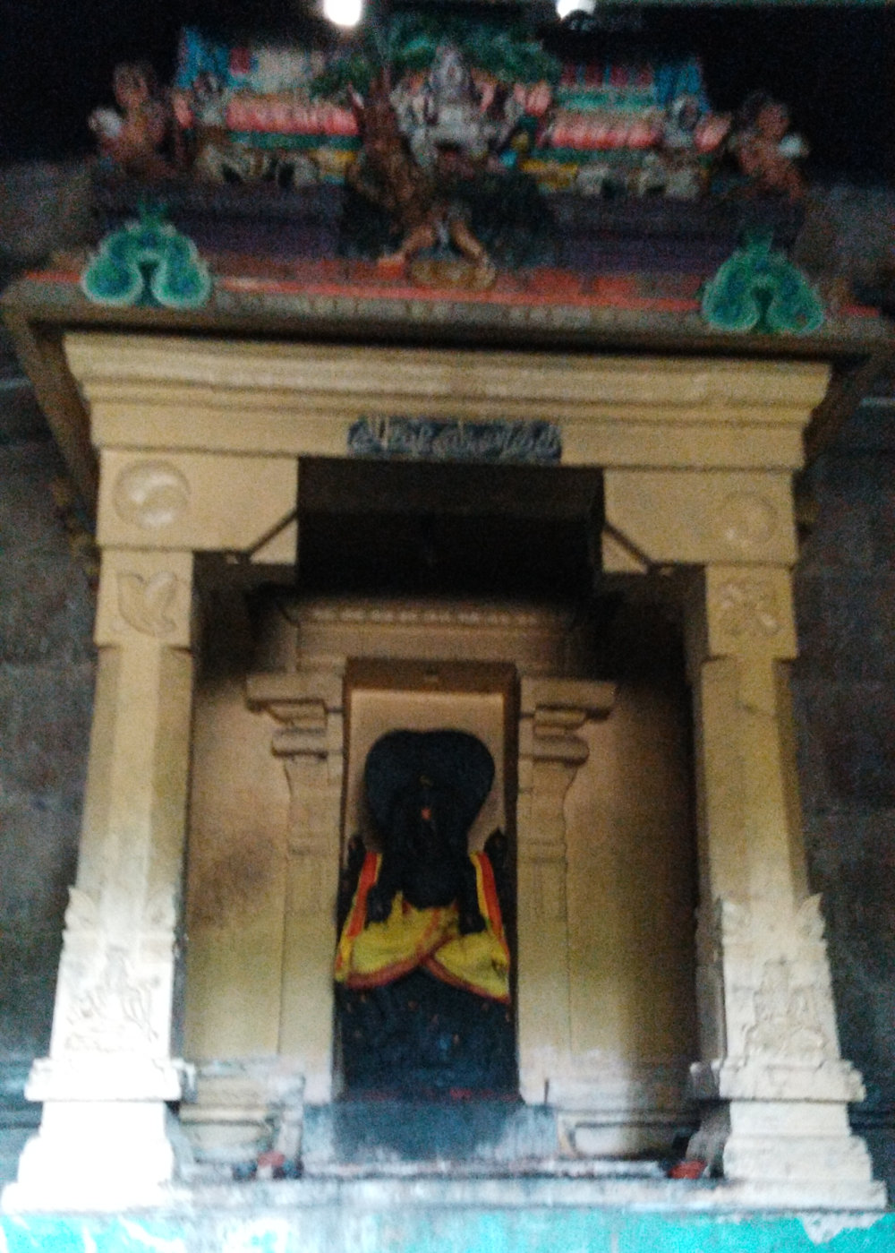 Beautifully engraved Idols of Saint Agasthiar, Saint Pulasthiar and palm trees can be seen at the entrance of the sanctum sanctorum.