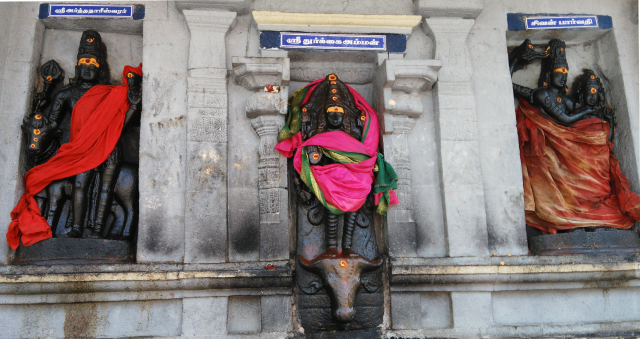 Also, this temple has some beautiful and intricately carved reliefs of Lords Natarajar and Sivakami, Pitchandavar, Ardhanareeswarar standing in front of his bull, Durgai standing on a buffalo’s head, Shiva and Parvathi, Goddess Sarasvathi and Veera Bathrar.